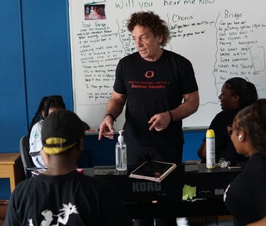 Technology involved, a musical keyboard and a very low tech white board where the kids under Jim’s guidance have been fashioning the Chorus, Bridge and Verses of the song.
